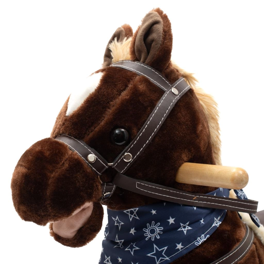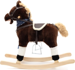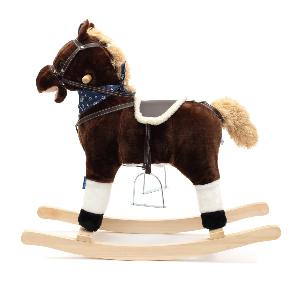 Das Schaukelpferd Baby Mix bietet Kindern ein authentisches Reiterlebnis. Es besteht aus weichem Plüsch, trägt ein stylisches Halstuch und hat in den Ohren versteckte Knöpfe, die Galoppgeräusche, Wiehern, Bewegung von Schwanz und Maul sowie ein Cowboylied auslösen. Profilierte Holz-Schaukelleisten beugen dem Umkippen vor, während Metallsteigbügel, Griffe und ein bequemer Sattel Komfort und Stabilität beim Schaukeln gewährleisten.