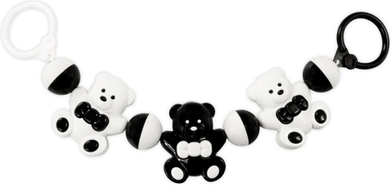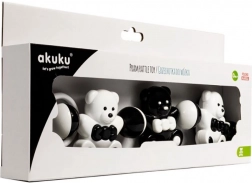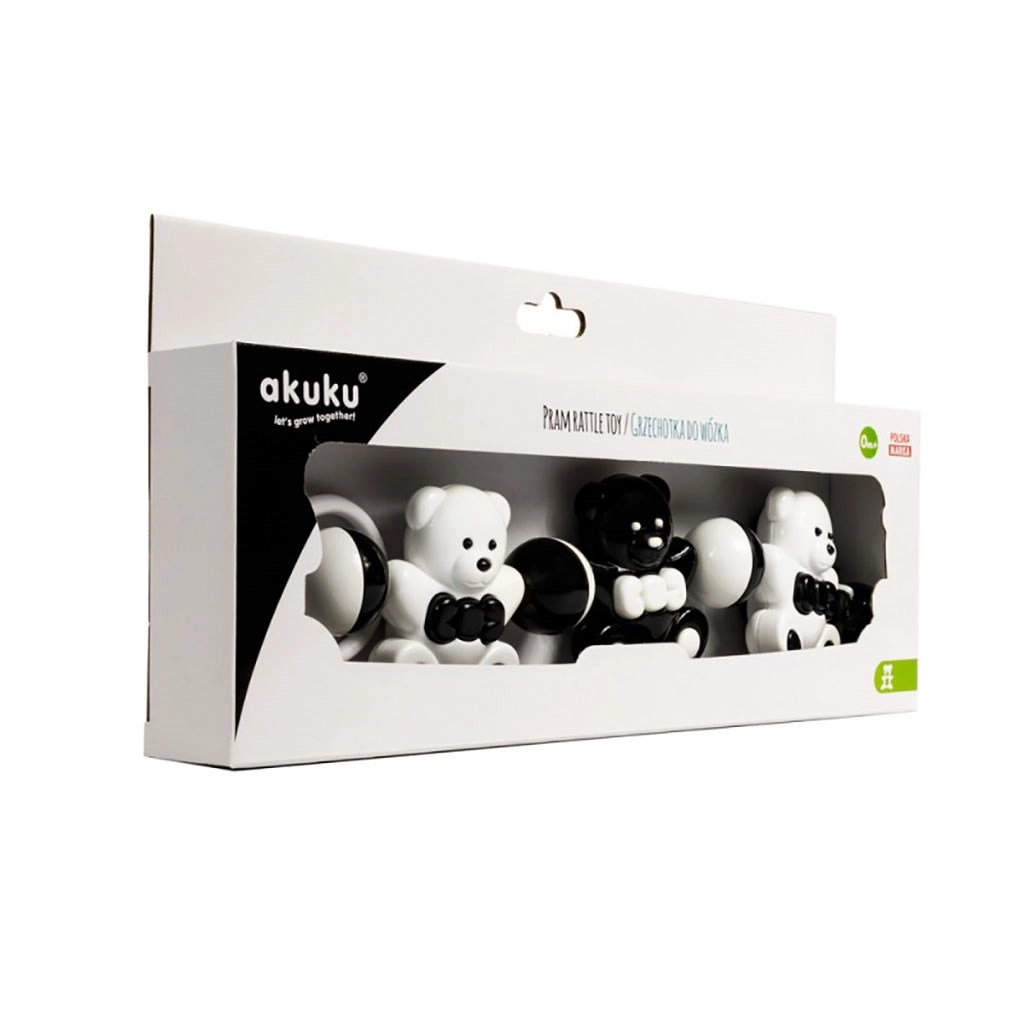 Die schwarz-weiße Akuku-Rassel mit Bären ist für die Allerkleinsten konzipiert und hilft, Sicht, Gehör und Motorik zu fördern. Kontrastreiche Farben ziehen das Baby an, das sanfte Rasseln beruhigt und stimuliert die Sinne. Das Spielzeug ist leicht, angenehm zu berühren und einfach sauber zu halten.