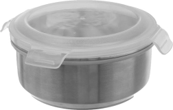 Diese strapazierfähige runde Lebensmittelbox kombiniert eine robuste Edelstahlschale mit einem transparenten Deckel und Gummidichtung. Vier stabile Clips sorgen für ein sicheres und dichtes Verschließen, sodass sie sich hervorragend für Saucen, Salate und Snacks eignet. Edelstahl ist robust und hygienisch und nimmt keine Gerüche an; die Schale ist spülmaschinengeeignet (Deckel wird für die Handwäsche empfohlen).