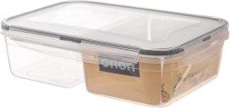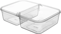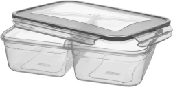 Die transparente Ausführung ermöglicht eine schnelle Kontrolle des Inhalts, ohne zu öffnen. Die robuste Konstruktion und die Silikondichtung im Deckel sorgen dafür, dass Saucen und Säfte nicht auslaufen. Zwei separate Fächer sind ideal für Salat und Beilage, Obst und Snack oder das Mittagessen für Arbeit und Schule.