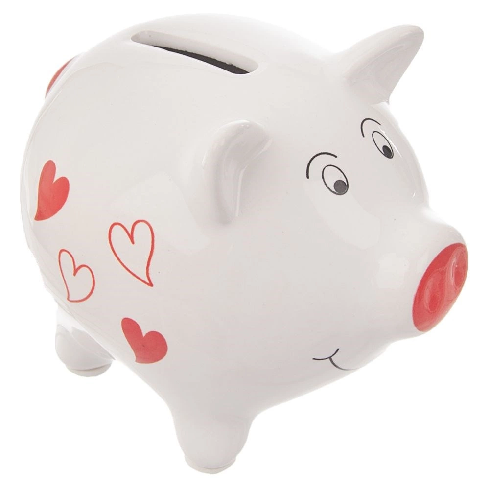 Die Keramik-Spardose Schweinchen ist eine tolle Wahl für Kinder und Erwachsene, die mit dem regelmäßigen Sparen von Münzen und Scheinen beginnen möchten. Die glänzende weiße Glasur mit roten Herzchen verleiht der Spardose einen verspielten Look, der sowohl in moderne Wohnräume als auch ins Kinderzimmer passt.