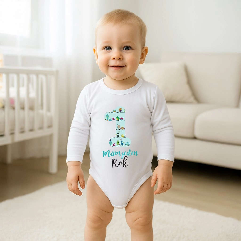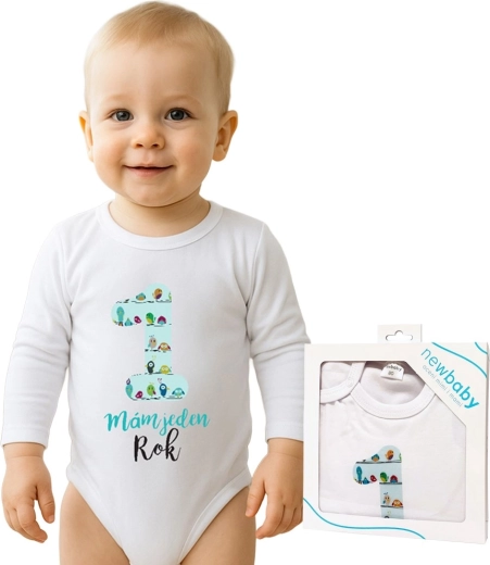 Origineller Baby-Body NEW BABY mit langen Ärmeln und fröhlichem Motiv einer großen Eins und dem Aufdruck Ich bin ein Jahr alt. Hergestellt aus 100 % Baumwolle mit zertifizierten, babysicheren Farben. Praktisches Druckknopf-Verschluss an der Schulter und im Schritt erleichtert das Wickeln und Anziehen. Tschechische Marke.