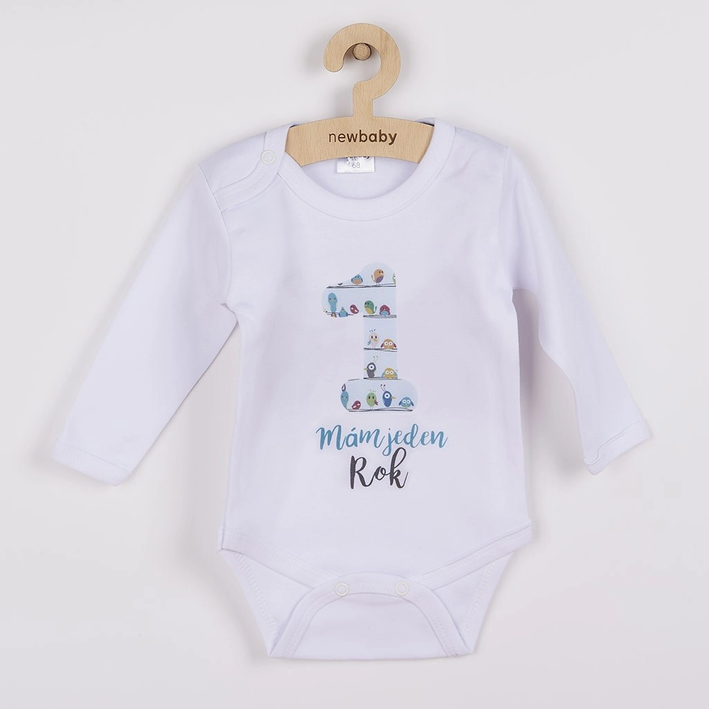 Süßer Baumwoll-Body mit langen Ärmeln der Marke New Baby mit großem Eins-Aufdruck und dem Schriftzug Ich bin ein Jahr alt. Hergestellt aus 100% Baumwolle mit zertifizierten, kinderfreundlichen Farben. Praktischer Druckknopfverschluss an der Schulter und im Schritt erleichtert Anziehen und Wickeln. Ideal als Geschenk zum ersten Geburtstag.