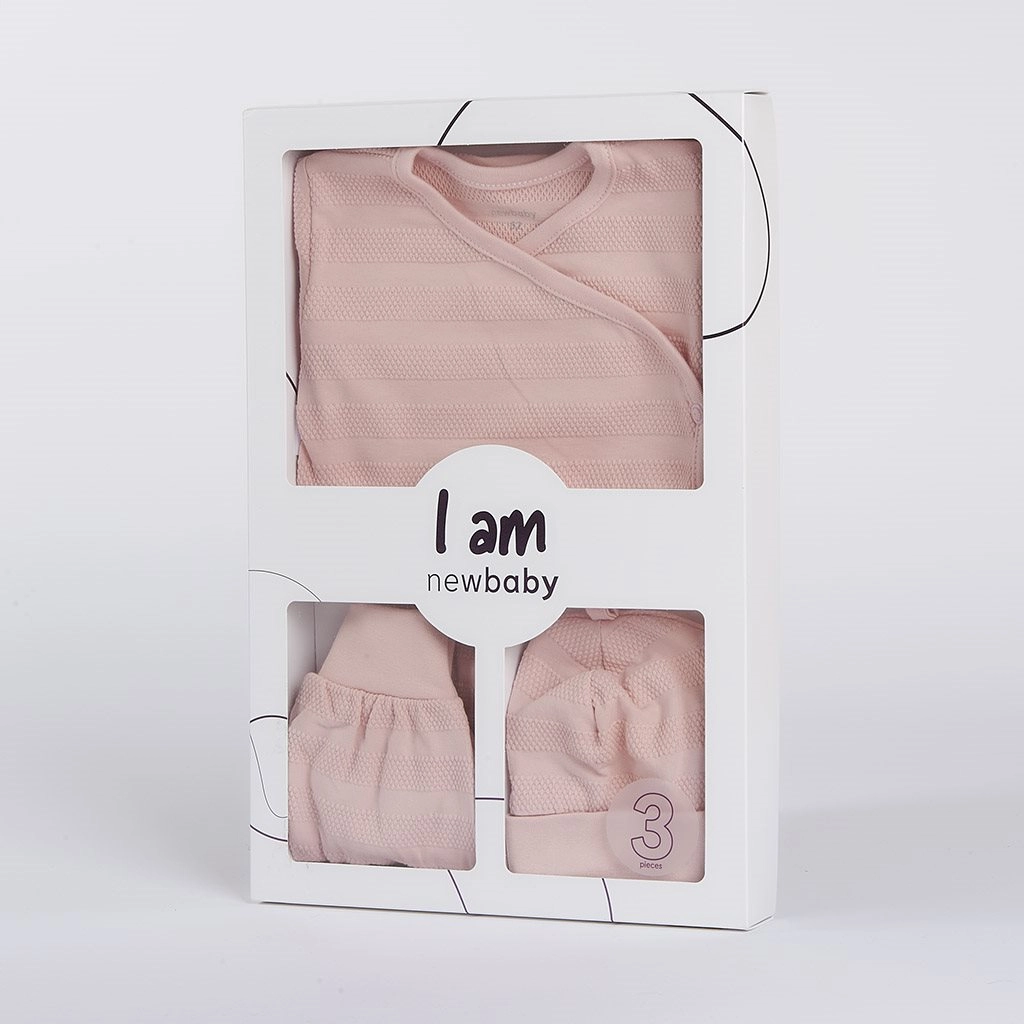 Das gesamte Set besteht aus 100% Baumwolle, die weich, atmungsaktiv und sanft zur empfindlichen Babyhaut ist. Das feine strukturierte Muster und der abgestimmte Rosaton verleihen dem Set ein elegantes und zeitloses Aussehen. Ideal für die Klinik, den Alltag und als stilvolles Geschenk.