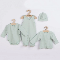 Das 4-teilige Set umfasst Body, Strampler, Jäckchen und Mützchen im abgestimmten Mint-Design – verpackt in einer umweltfreundlichen Geschenkbox.