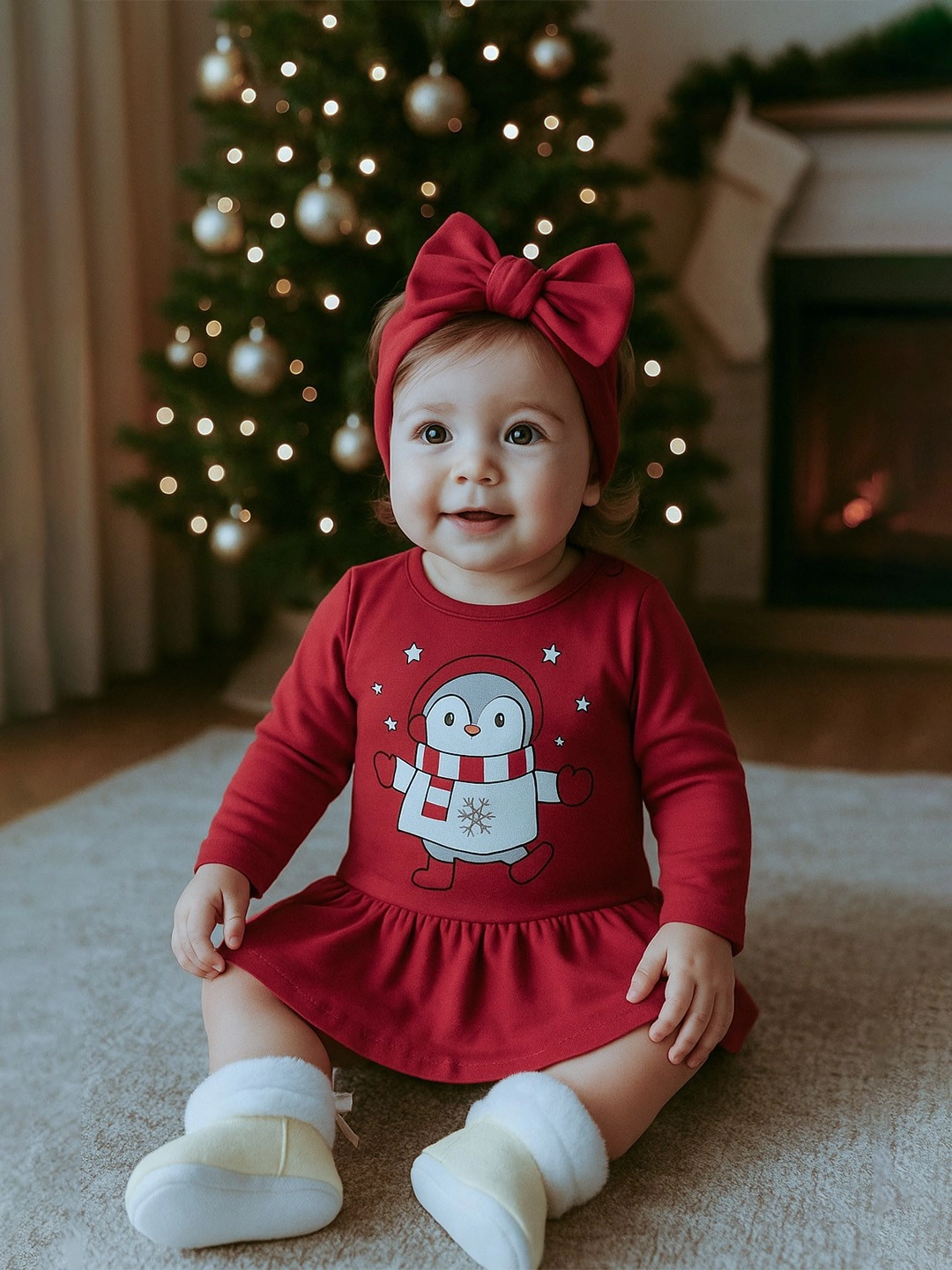 Stylisches und bequemes Baby-Kleid in sattem Rot – ideal für den Alltag und festliche Momente. Das fröhliche Pinguinmotiv verleiht dem Outfit Verspieltheit, während der hochwertige Baumwolljersey ganztägigen Komfort bietet.