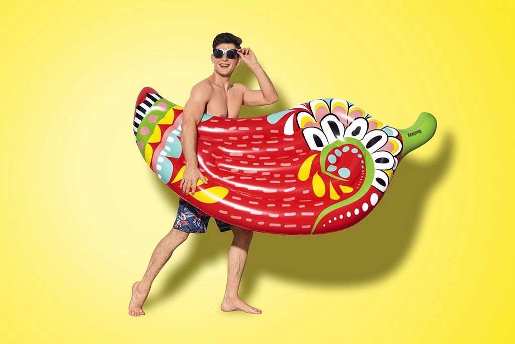 Die stylische aufblasbare Luftmatratze Bestway Chili sorgt für Sommerlaune und eine verspielte Atmosphäre. Das farbenfrohe, von der Aztekenkultur inspirierte Motiv in Chili-Form fällt sofort ins Auge, während die durchdachte Konstruktion bequemes Liegen und ausgezeichneten Auftrieb auf dem Wasser gewährleistet. Dank der 2 Luftkammern und der robusten I-Träger-Konstruktion ist die Matratze stabil und widerstandsfähig.
