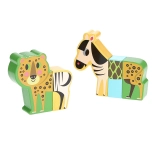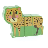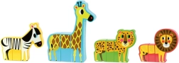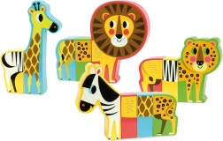 Vier Safari-Tiere mit magnetischen Teilen lassen sich frei untereinander kombinieren – perfekt zur Förderung von Kreativität und Fantasie.