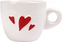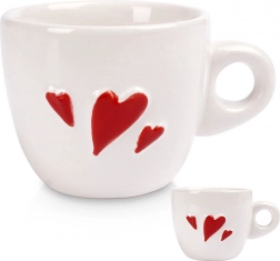 Genießen Sie Ihren Lieblingsexpresso aus einer Tasse, die Augen und Hände erfreut. Weiße Keramik mit plastischen roten Herzchen verleiht Ihrem Tisch eine romantische Note, während das kompakte 80-ml-Volumen die reichhaltige Crema und das Aroma des Kaffees hervorhebt.