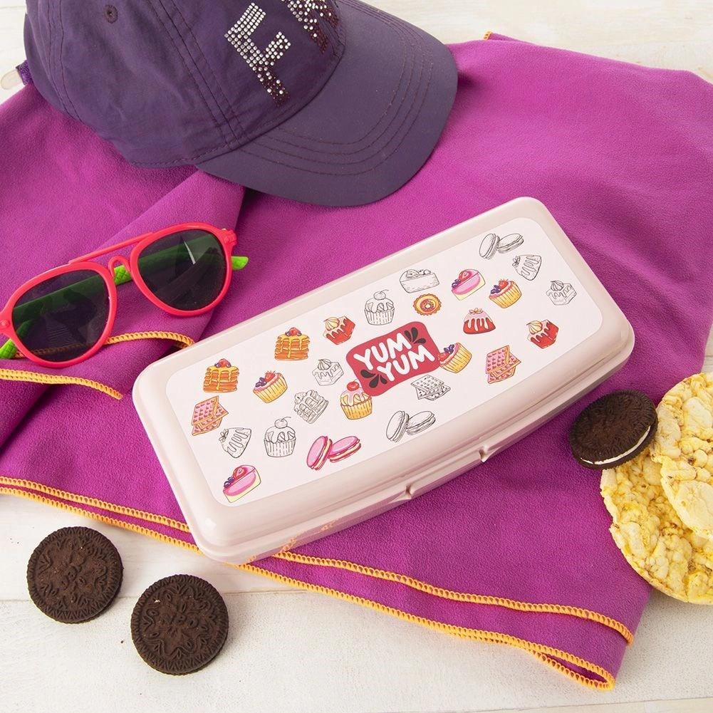Der fröhliche Druck mit Desserts und dem Schriftzug YUM YUM spricht Kinder an und hilft ihnen, ihre Dose leicht zu erkennen.