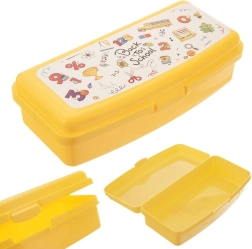 Gelbe Brotdose mit einem geräumigen Fach und festem Deckel mit Clip hält Ihr Essen frisch und sicher verstaut. Dank der glatten Oberflächen ist sie leicht zu reinigen und ihre kompakte Form passt hervorragend in Schulranzen oder Rucksack.