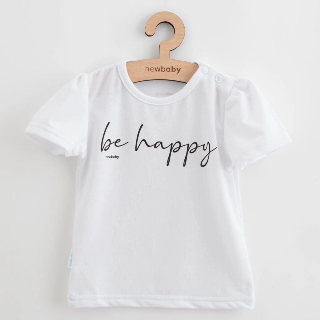 Dieses Sommer-Mädchenset NEW BABY Be Happy überzeugt durch weiches, hochwertiges Material – ideal für jeden Tag. Das Kurzarm-T-Shirt ist mit einem fröhlichen Print und dem Schriftzug „be happy“ verziert und lässt sich leicht über den Kopf anziehen; ein Druckknopf an der Schulter erleichtert das Umziehen.