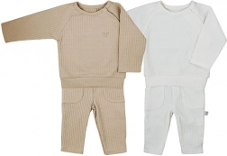 Das Set ist aus hochwertigem, angenehm weichem Material mit interessanter Struktur und feinem Muster gefertigt. Dank des Elastan-Anteils hält es die Form und ermöglicht freie Bewegung den ganzen Tag. Ideal für zu Hause und Spaziergänge.