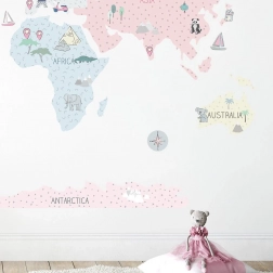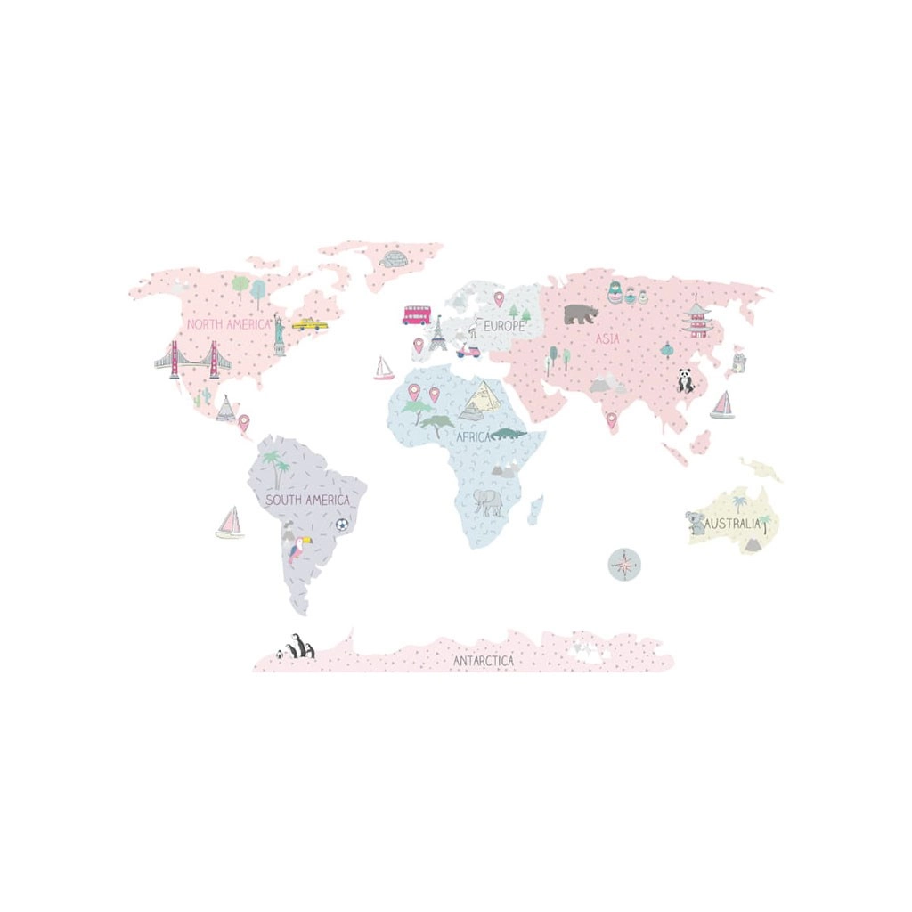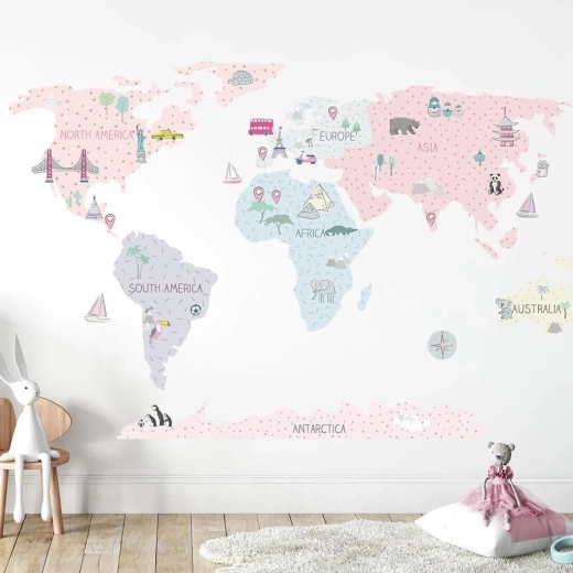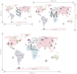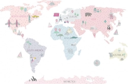 Die rosa Weltkarte in Größe L ist eine elegante und zugleich praktische Wanddekoration fürs Kinderzimmer. Gedämpfte Pastellfarben passen hervorragend in moderne Interieurs und sorgen für eine angenehme Atmosphäre zum Spielen und Lernen. Kinder machen sich spielerisch mit Kontinenten, Ozeanen, Himmelsrichtungen und bekannten Sehenswürdigkeiten vertraut.