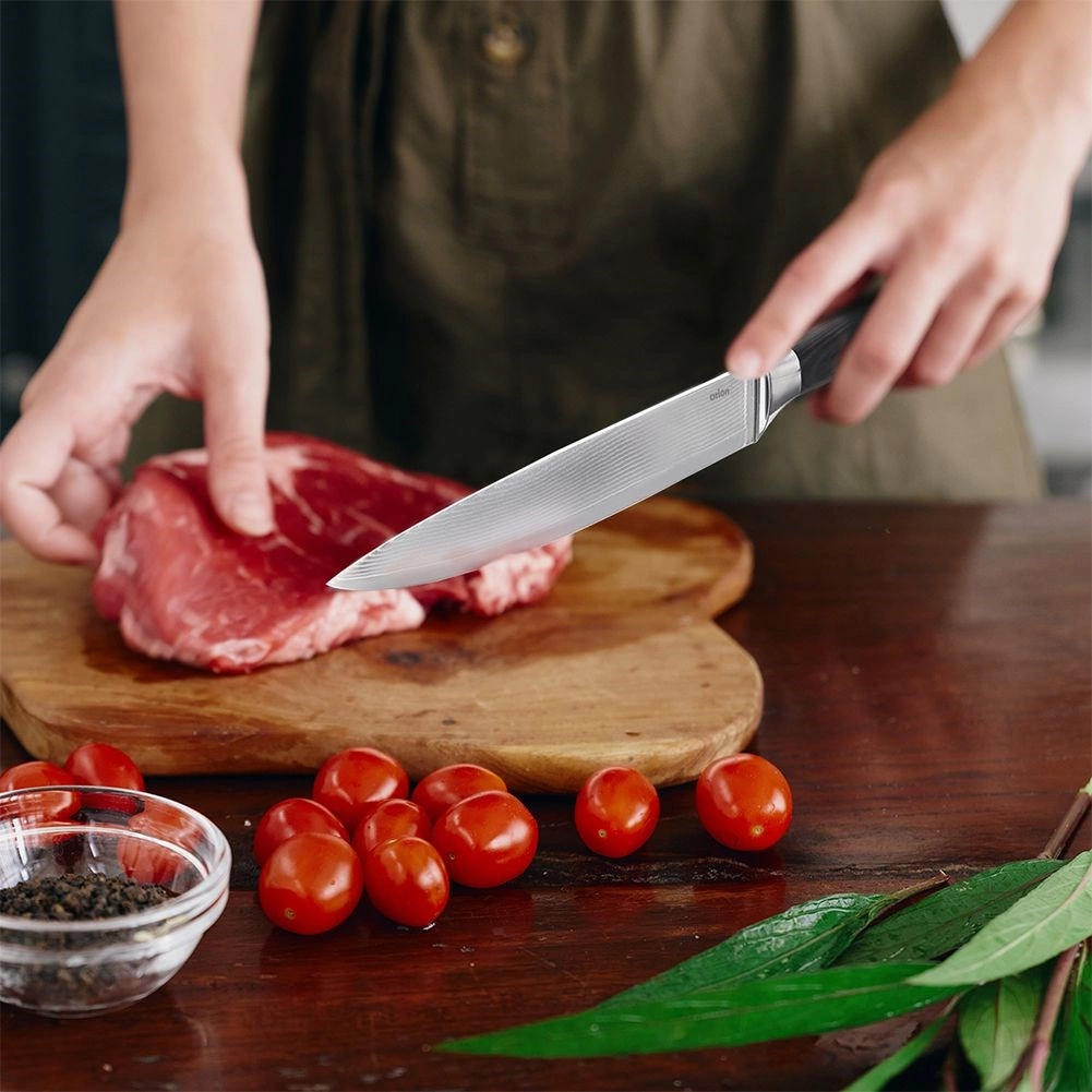 Das Messer ist eine ausgezeichnete Wahl für die tägliche Zubereitung – vom feinen Schneiden von Obst und Gemüse über das Hacken von Kräutern bis hin zum Portionieren von Fleisch. Bei sachgemäßer Verwendung behält es seine Schärfe lange und wird zu einem unverzichtbaren Helfer in jeder Küche.