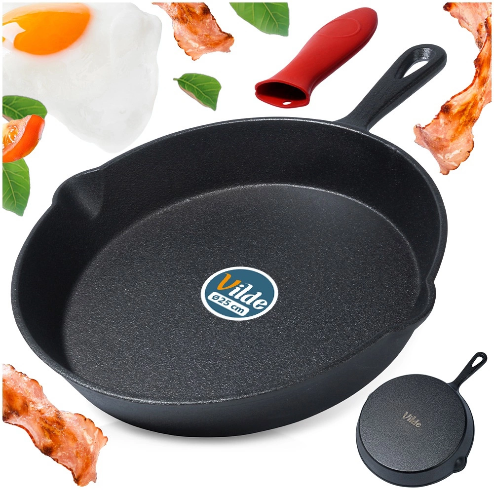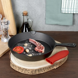 Im Lieferumfang enthalten ist ein roter Silikon-Überzug für sicheres Hantieren am heißen Griff. Die Pfanne ist für alle Herdarten einschließlich Induktion, für den Backofen, den Grill und direkt über offenem Feuer geeignet – ideal für die Küche, zum Campen und fürs Grillen im Garten.