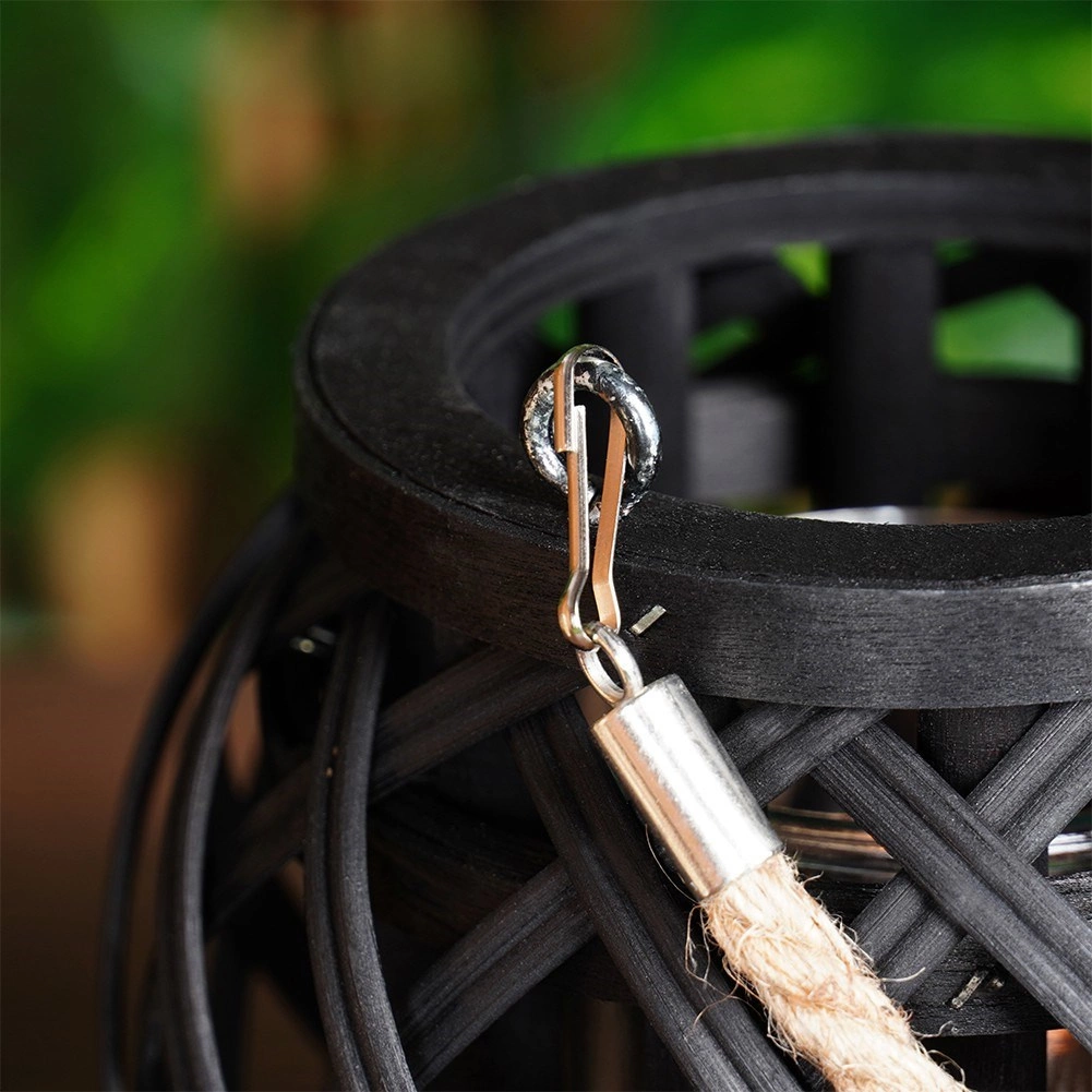Dieser dekorative Lampion aus natürlichem, schwarz lackiertem Bambusholz eignet sich ideal für gemütliche Abende auf dem Balkon, der Terrasse oder im Wohnzimmer. Die offene Flechtkonstruktion schafft effektvolle Lichtreflexe und verleiht dem Raum eine angenehme, beruhigende Atmosphäre.