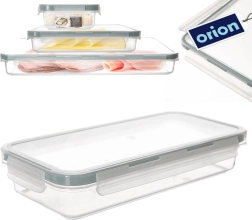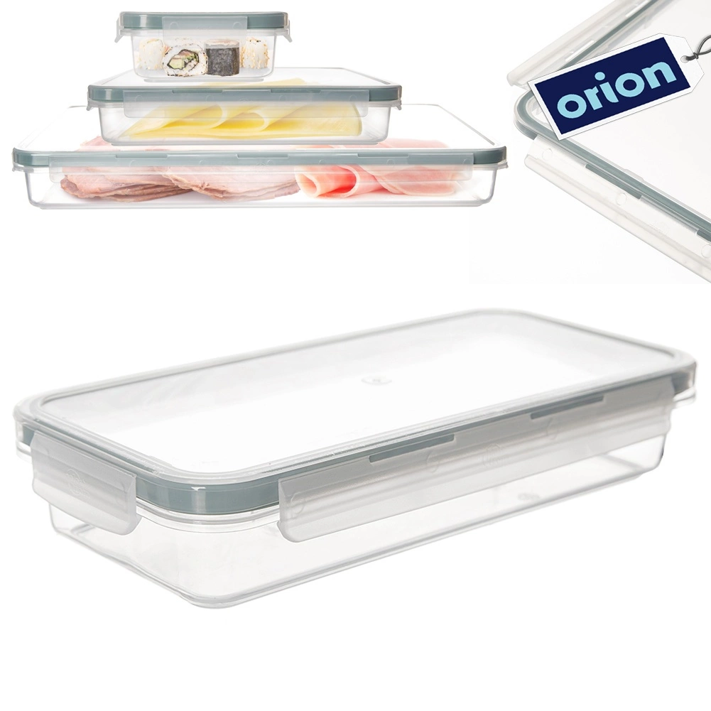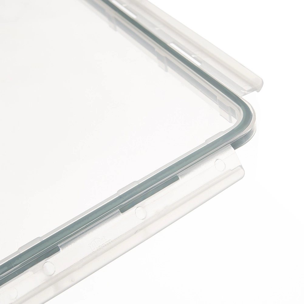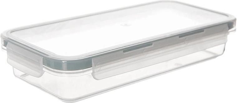 Universelle, niedrige Lebensmittelbox aus robustem, transparentem Kunststoff – perfekt zum Aufbewahren, Transportieren und Organisieren von Speisen. Dank des festen Deckels mit 4 Clips und hochwertiger Silikondichtung ist der Inhalt vor Luft und Feuchtigkeit geschützt, sodass Lebensmittel länger frisch bleiben.