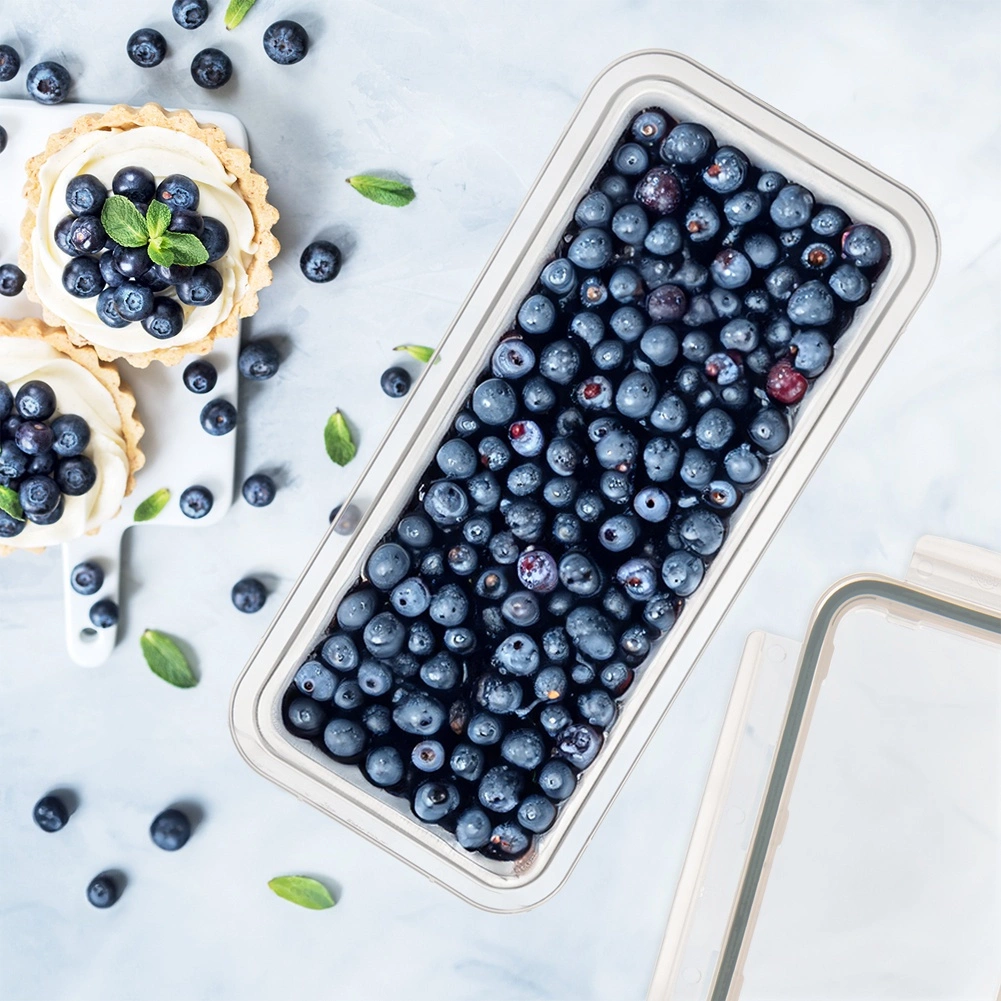 Das niedrige Profil und der flache Deckel sparen Platz im Kühlschrank und ermöglichen ein sicheres Stapeln mehrerer Behälter.
