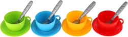 Teekanne, 4 Tassen, 4 Untertassen, 4 Löffel (Farbkombination)