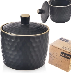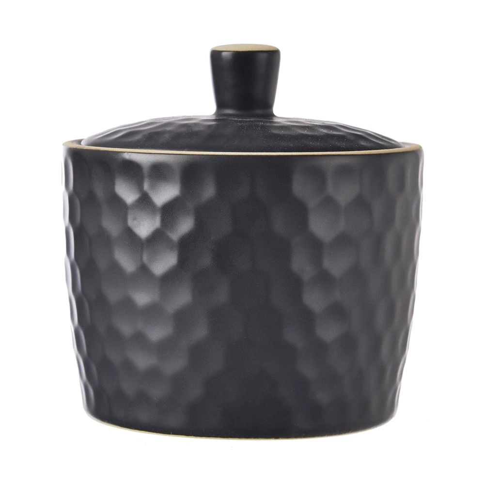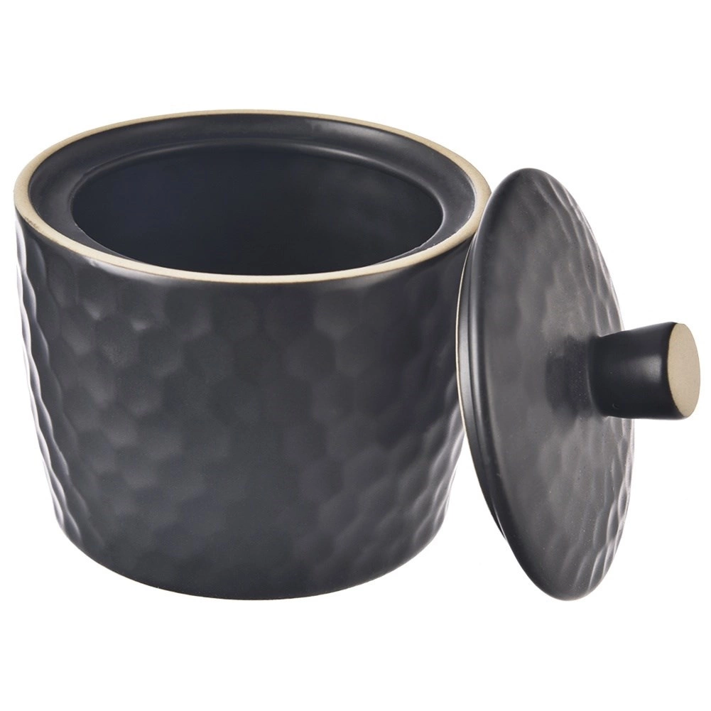 Diese elegante Zuckerdose aus der Reihe TEA TIME besticht durch ihr modernes schwarzes Design und ein Relief im Stil von Bienenwaben. Hochwertiges Steingut sorgt für Langlebigkeit und eine angenehme, matt strukturierte Oberfläche, die gut in der Hand liegt.