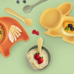 Praktischer Silikon-Babylöffel mit einer Länge von 14 cm für die Kleinsten bis 3 Jahre. Er ist weich und sicher für empfindliches Zahnfleisch, ohne scharfe Kanten, hat eine ergonomische Form für kleine Hände und ist spülmaschinengeeignet. Ideal zum Üben des selbstständigen Essens.