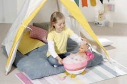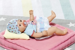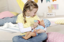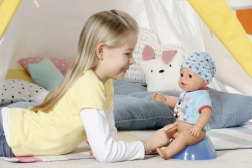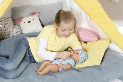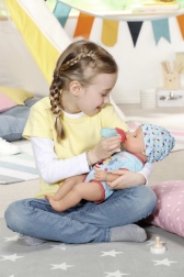 Zum Set gehören 10 Zubehörteile, die alle Funktionen unterstützen und Fantasie, Kommunikation und Empathie fördern. Kinder lieben realistische Spielszenarien – Füttern, Baden und Einschlafen. Die Puppe trägt einen blauen Body und ein Mützchen und ist bereit, der beste Freund jeder kleinen Pflegerin oder jedes kleinen Pflegers zu werden.