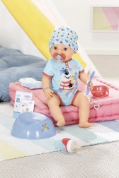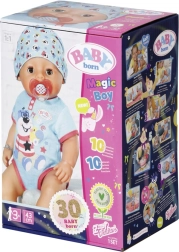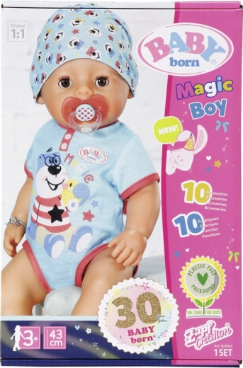 Entdecken Sie die Magie der Baby-Pflege mit der Puppe BABY born Magic Boy. Dank des Soft Touch-Körpers ist sie angenehm weich und leicht umzuziehen. Der magische Schnuller ermöglicht der Puppe, die Augen in jeder Position zu öffnen und zu schließen; die Augen können auch blinzeln. Die Puppe trinkt Wasser aus der Flasche, isst Brei, kann in die Windel oder aufs Töpfchen machen, vergießt echte Tränen und macht sogar Aa – das alles ohne Batterien.