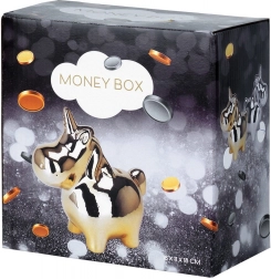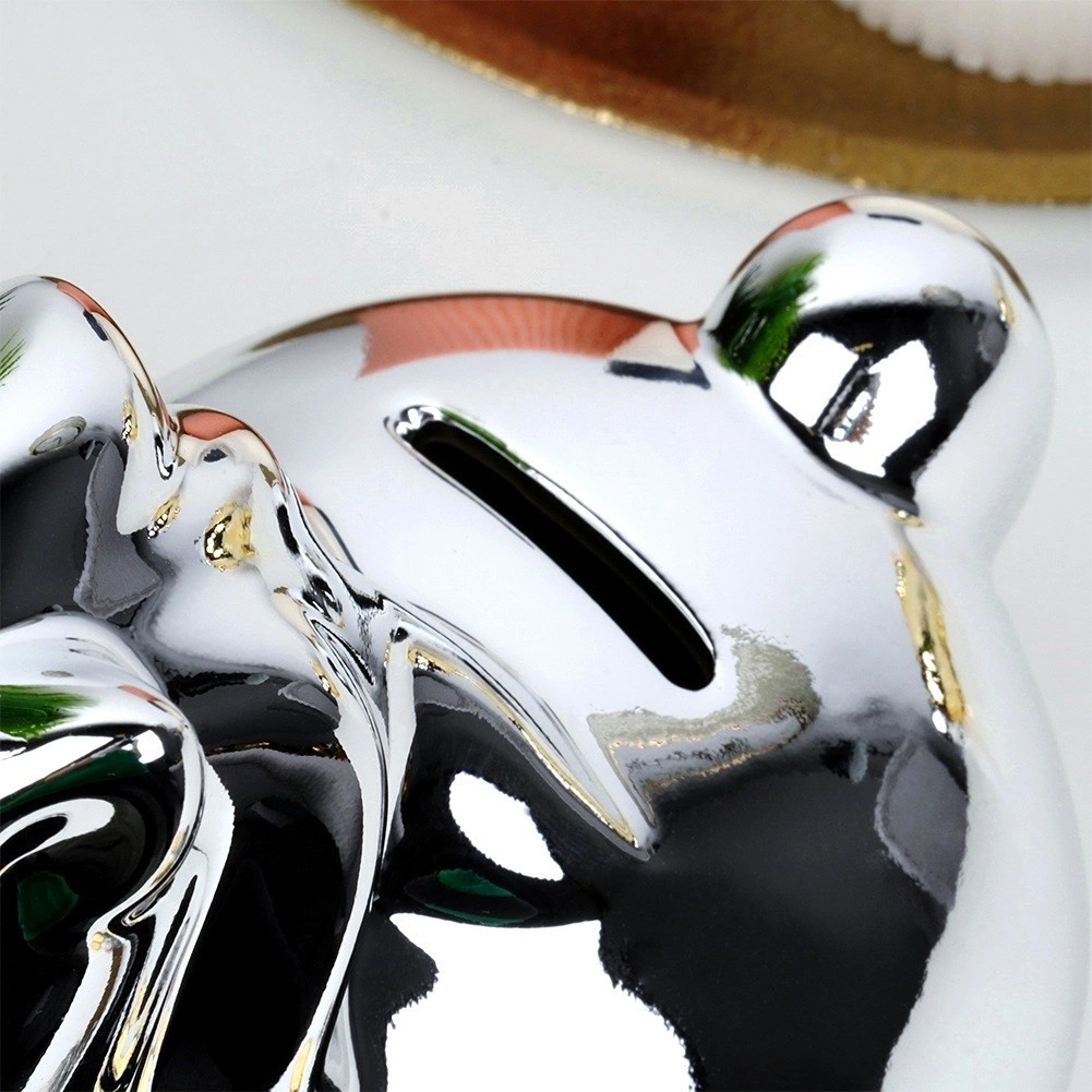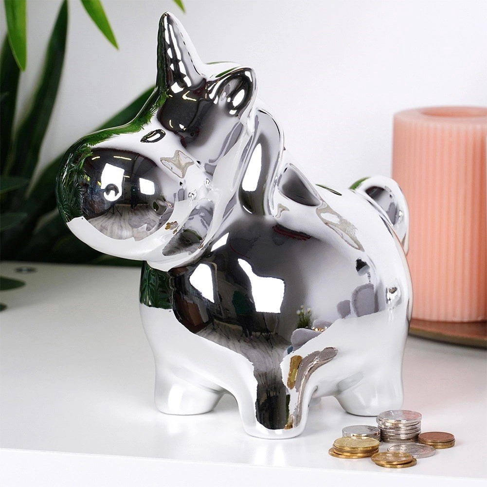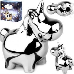 Diese keramische Einhorn-Spardose besticht durch ihre spiegelnde silberne Oberfläche, die Ihrem Zuhause einen Hauch von Glamour verleiht. Mit den Maßen 18 × 10,5 × 18 cm bietet sie genügend Platz für Kleingeld und gefaltete Geldscheine und steht stabil auf Regal, Kommode oder Schreibtisch.