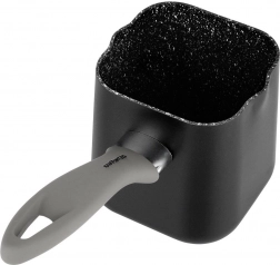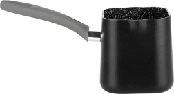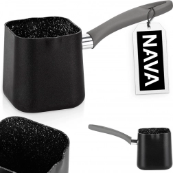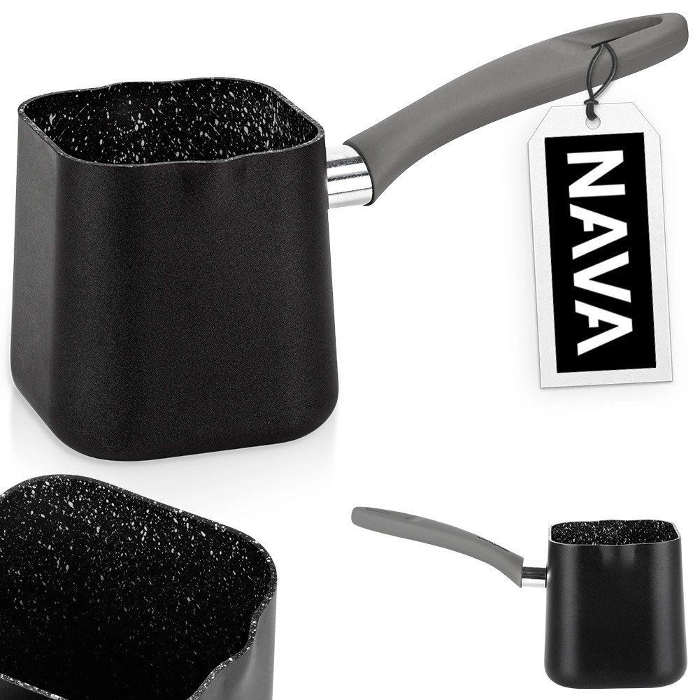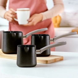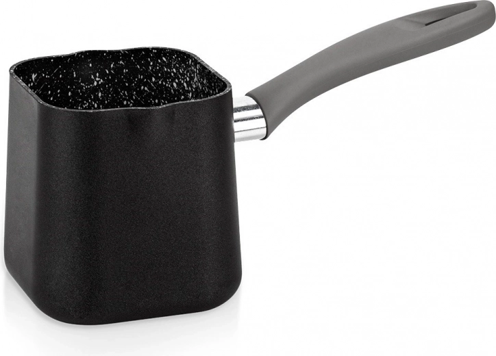 Entdecken Sie eine elegante Cezve für türkischen Kaffee, die modernes Design mit Alltagstauglichkeit verbindet. Der Aluminiumkorpus mit antihaftender Granitbeschichtung sorgt für gleichmäßige Erwärmung, Kratzfestigkeit und leichte Reinigung. Das matte schwarze Äußere und die innen schwarze, cremegesprenkelte Oberfläche unterstreichen den Premium-Look.