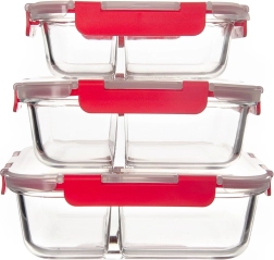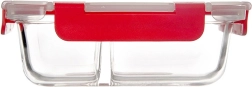 Hergestellt aus Borosilikatglas, beständig gegen Temperaturen von -20 °C bis 300 °C. Der Deckel mit roter Silikondichtung und vier Snap-Lock-Clips sorgt für ein auslaufsicheres Verschließen und längere Frische. Die Dichtung zwischen den Fächern verhindert ungewolltes Überlaufen.