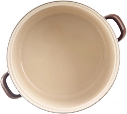 Der elegante Topf im Retro-Stil kombiniert eine braune Außenseite mit einer cremefarbenen Innenseite und einem Edelstahlrand für zusätzliche Widerstandsfähigkeit. Die gesundheitlich unbedenkliche Emailleschicht ist schonend zu Speisen und Allergikern, sorgt für einfache Reinigung und lange Lebensdauer. Dank des Volumens von 8 l bereiten Sie bequem Brühen, Gulasch und Pasta für die ganze Familie zu.