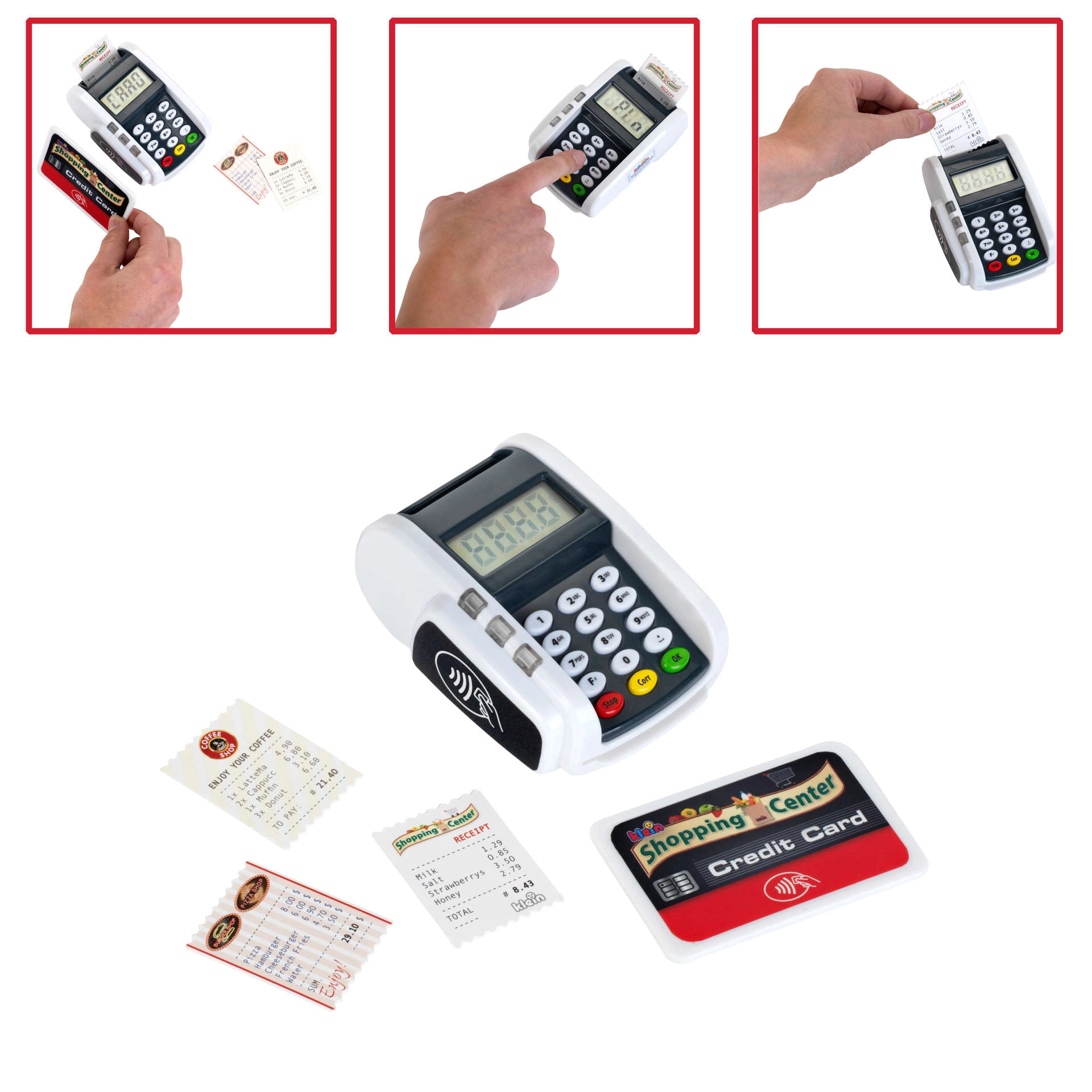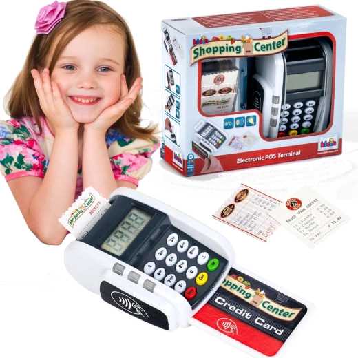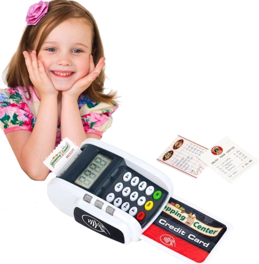 Dieses kompakte Terminal ahmt ein echtes Gerät überzeugend nach: Kinder können die Zifferntastatur drücken, eine Zahlungskarte auflegen und „Kassenbons“ drucken – für ein realistisches Kassen-Spiel. Licht- und Soundeffekte geben jeder Transaktion den richtigen Hauch von Realität und fördern soziale Kompetenzen.