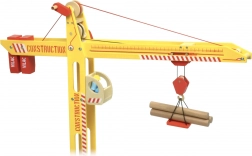 Zum Lieferumfang gehören bewegliche Figuren eines Kranführers und eines Arbeiters, eine Plattform, ein magnetischer Haken, verschiedene Lasten und Verkehrsschilder zur Absperrung des Arbeitsbereichs – insgesamt 12 Teile Zubehör. Hochwertige Materialien (Massivholz, widerstandsfähiges Sperrholz, Metallelemente) und unbedenkliche Farben sorgen für langen und sicheren Spielspaß.