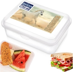 Praktische Lunchbox mit einem Volumen von 750 ml, ideal für Canapés, Pausenbrote und Kleinigkeiten. Sie hat die Maße 18 × 13 × 7 cm, ist transparent und mit einem Pferdemotiv verziert. Dank des robusten Clips schließt sie zuverlässig und hält Ihr Essen länger frisch. Spülmaschinengeeignet und mikrowellengeeignet (mit geöffnetem Deckel bis 400 W).