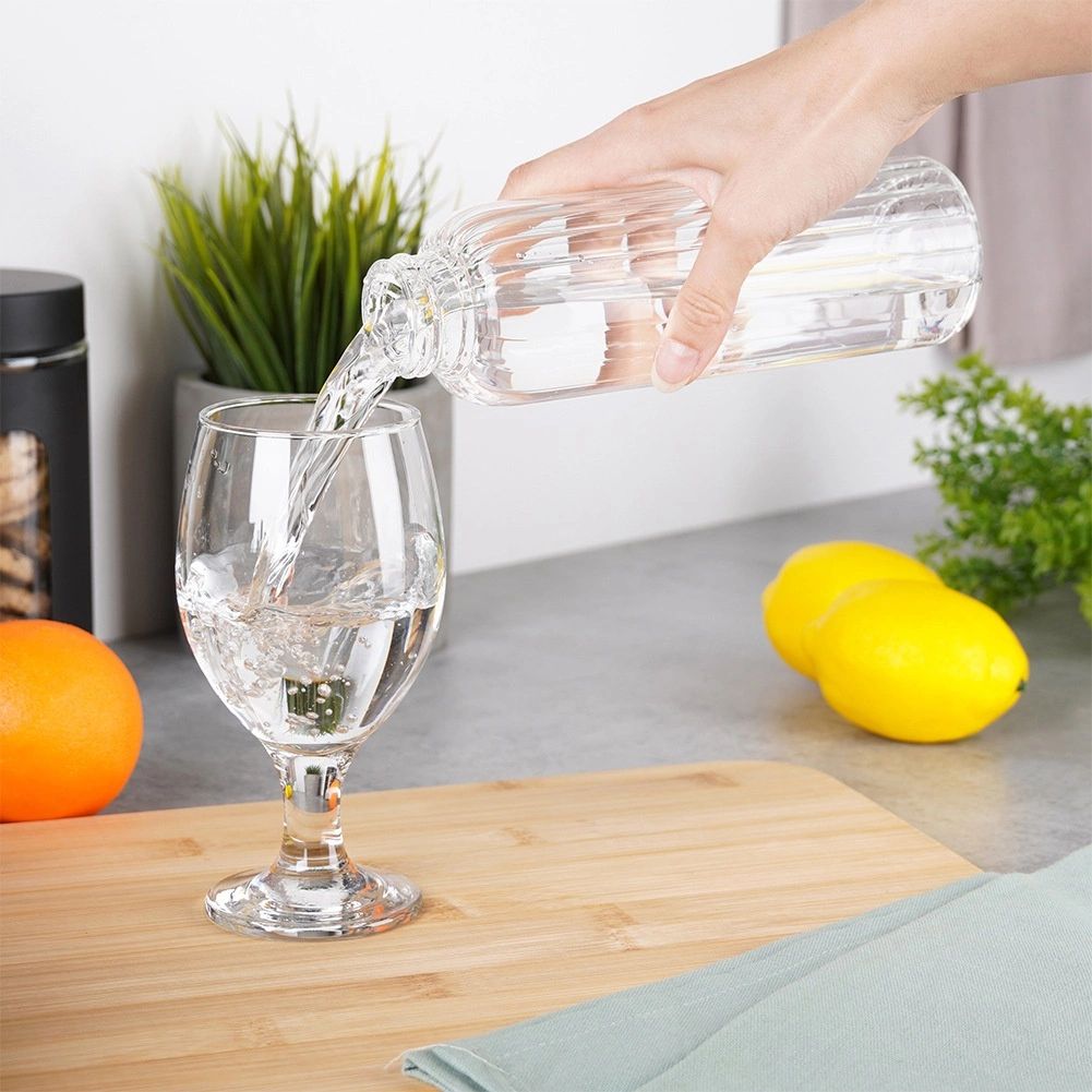 Vertikale Riffelung des Glases verbessert die Griffigkeit und verleiht der Flasche einen modernen Look – ideal fürs Büro und unterwegs.