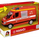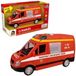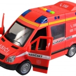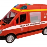 Dieser Feuerwehr-Lieferwagen begeistert alle kleinen Retter durch seine realistische Ausführung und Funktionen. Beim Drücken der Tasten hörst du tschechische Stimmen der Leitstelle und Besatzung und siehst das blinkende Blaulicht. Dank des Schwungradantriebs schiebst du das Fahrzeug einfach an und es fährt nach vorn.