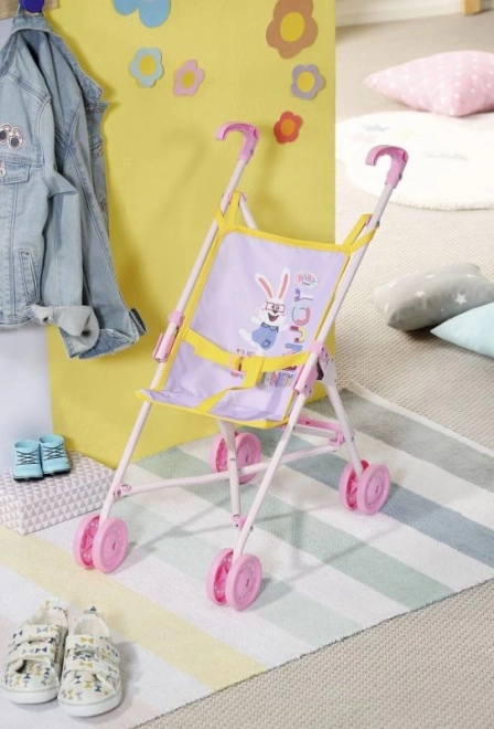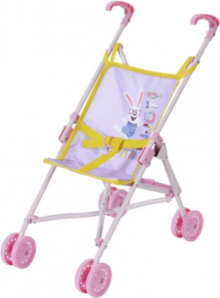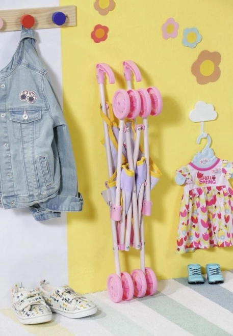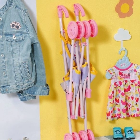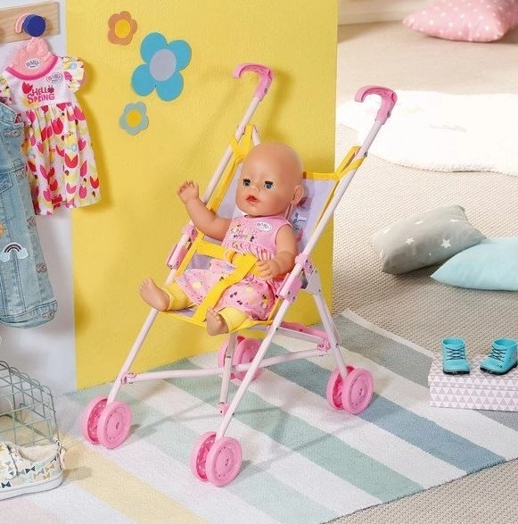 Der wendige Kinderwagen von BABY BORN zaubert jedem ein Lächeln ins Gesicht. Auf dem rosa Sitz blickt die Puppe BABY BORN neugierig in die Welt, während sie den Passanten im Park zuwinkt. Ein Gurtband sorgt dafür, dass die Puppe sicher im Wagen bleibt. **Ideale Höhe für kleinere Kinder:** Der Griff hat eine Höhe von 53 cm. Nach einem Spaziergang lässt sich der Buggy einfach zusammenklappen und verstauen.