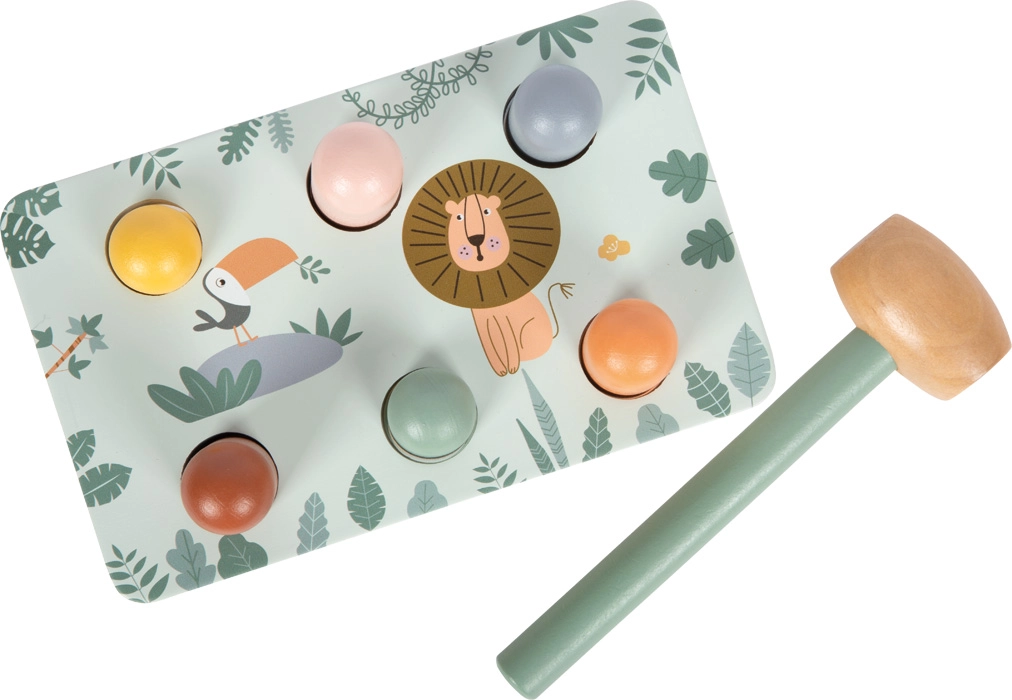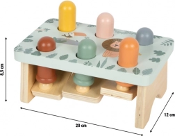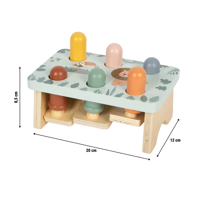 Diese hochwertige Holz-Klopfbank in Pastellfarben ist ideal für erste Geschicklichkeitsspiele ab 1 Jahr. Der Hammer liegt gut in kleinen Händen und die bunten Stifte laden zu wiederholtem Spiel ein, das Konzentration, Wahrnehmung und schnelle Reaktionen natürlich fördert.