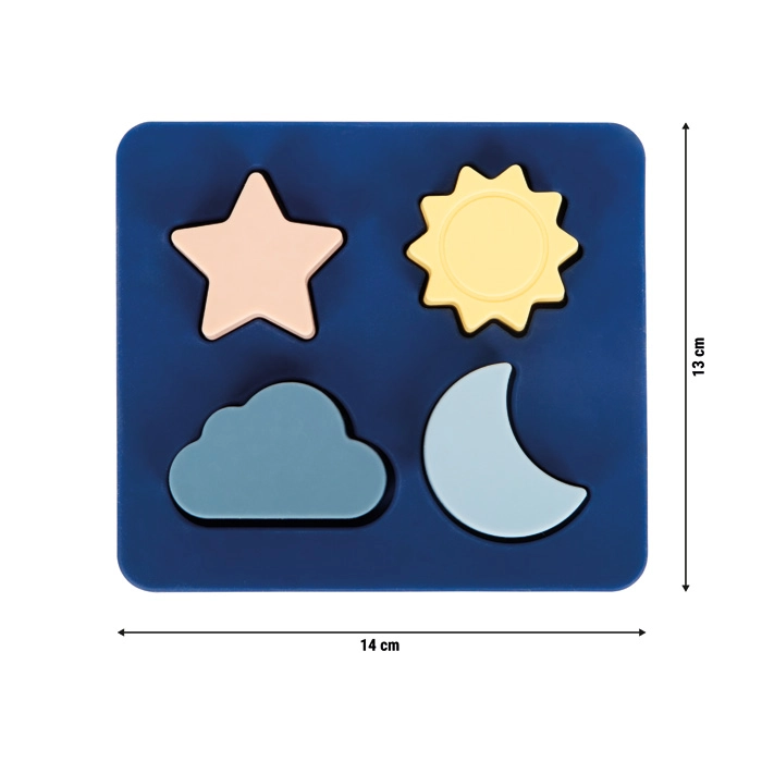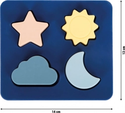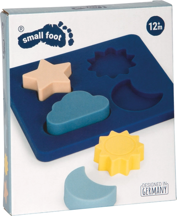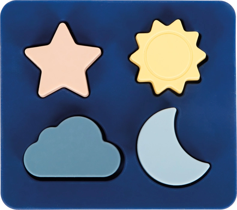 Das Silikonpuzzle small foot ist für kleine Hände und neugierige Köpfe konzipiert. Vier pastellfarbene Formen – Sonne, Mond, Stern und Wölkchen – lassen sich leicht greifen und von verschiedenen Seiten in die Basis einsetzen, was Kreativität sowie das intuitive Lernen von Formen und Farben fördert. Das BPA-freie, lebensmittelechte Silikon ist weich im Griff, geruchsneutral und absolut sicher, auch bei Mundkontakt.