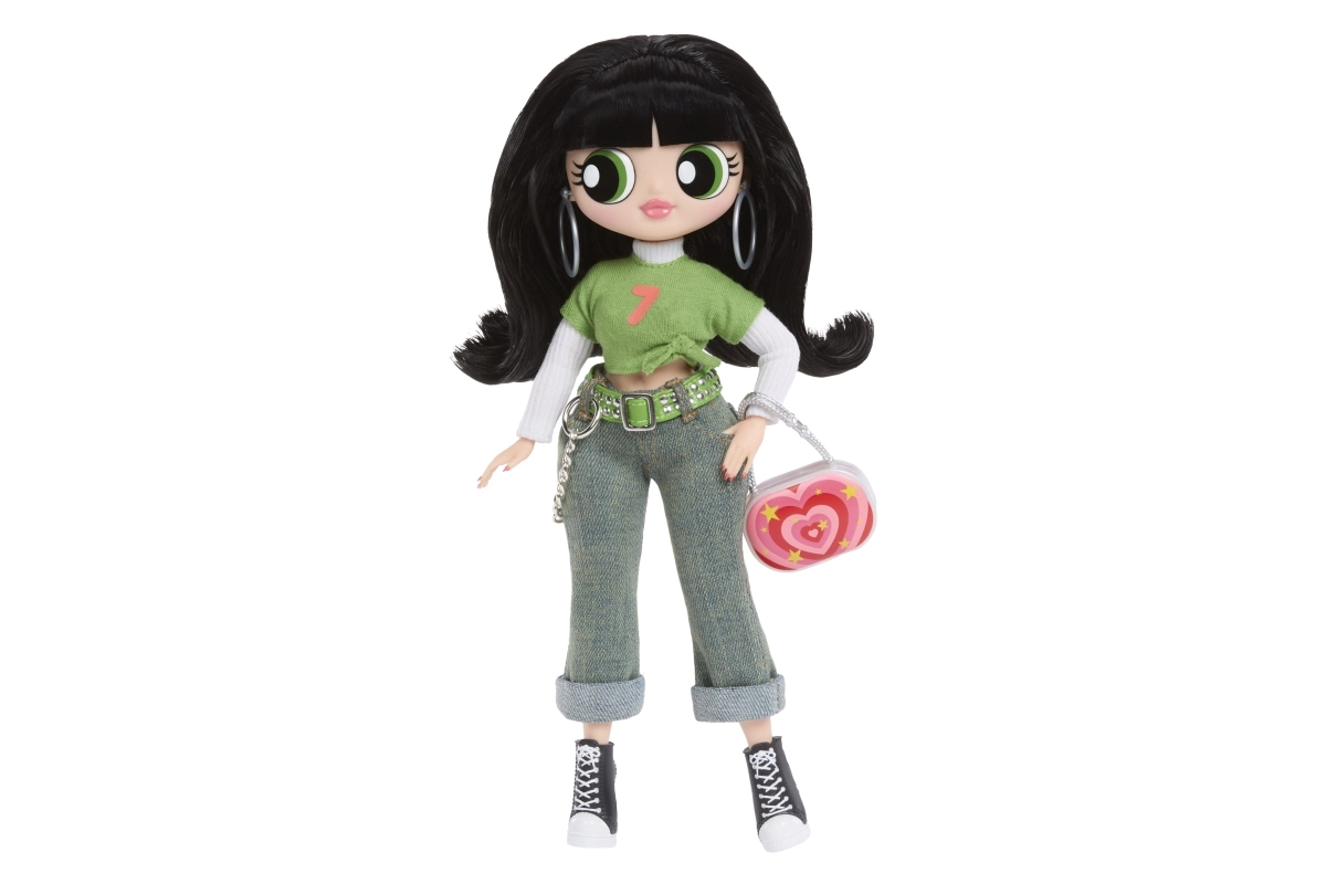 Grünes Crop-Top, Jeans mit Kette und schwarze Sneaker werden durch eine auffällige Tasche und Ohrringe ergänzt – der ikonische Buttercup-Look im L.O.L.-Style.