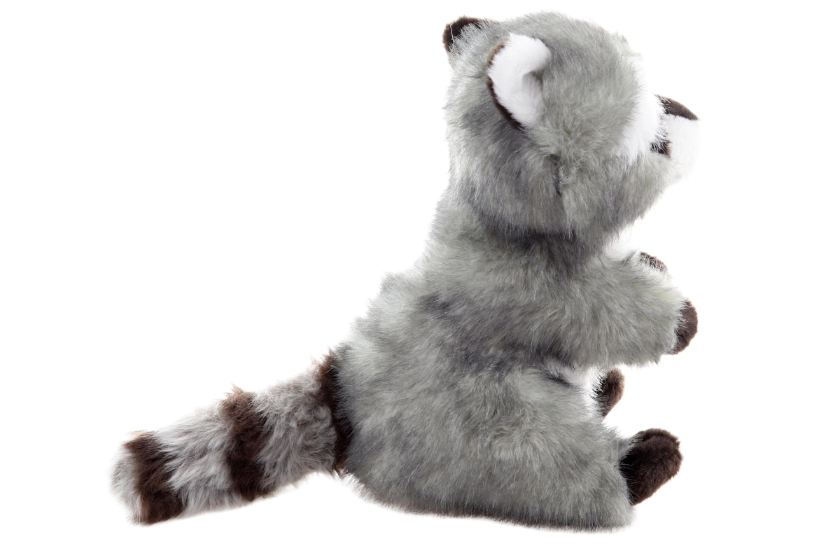 Auffällige Gesichtsmaske, gestreifter Schwanz und ein aufgesticktes Lächeln verleihen dem Waschbären Charakter – in sicherer Ausführung ohne scharfe Teile.