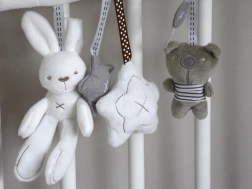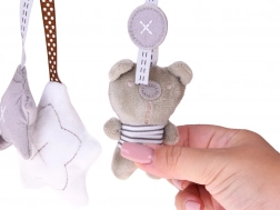 Das niedliche Hängespielzeug in neutralen Farben begeistert Babys zu Hause und unterwegs. Mit Bändern lässt es sich leicht am Bettchen oder Kinderwagen befestigen. Es bietet weichen, flauschigen Plüsch, sanfte Sinnesreize und spaßige Geräusche: Beim Drücken auf den Bauch des Häschens ertönt eine kurze Melodie, der weiße Stern hat eine Quietsche und der Bär funktioniert als Rassel.