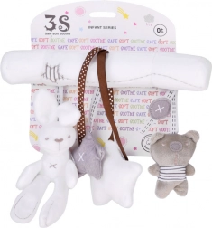 • 3 Hängeelemente – Häschen mit Melodie, Stern mit Quietsche, Bär als Rassel.