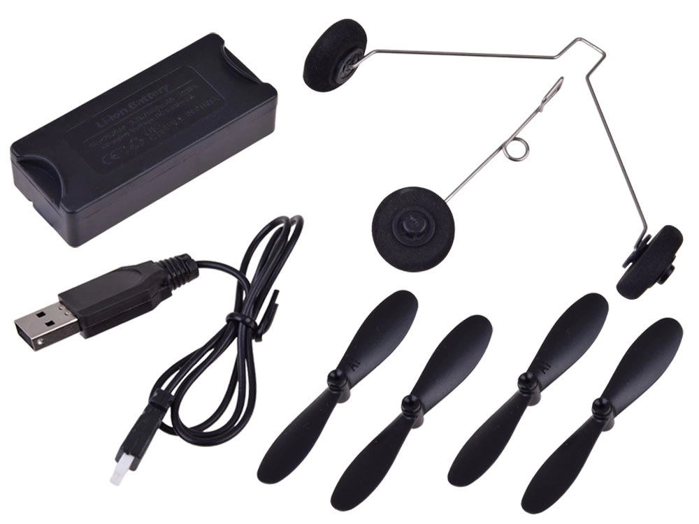 Im Set enthalten sind Ersatzpropeller, Fahrwerk, USB-Kabel und 2,4-GHz-Fernsteuerung. Einfach zusammenbauen, laden und abheben.