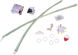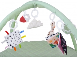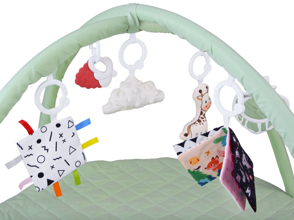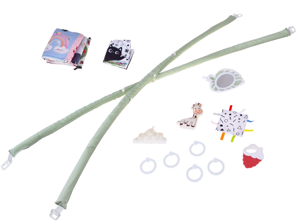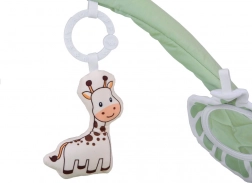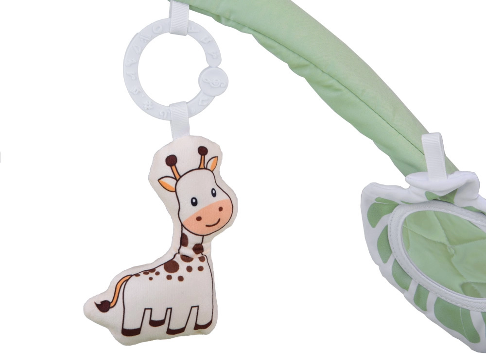 Zwei flexible Bögen lassen sich zum Waschen oder für unterwegs leicht abnehmen. Die aufgehängten Spielzeuge – Beißring, Wölkchen, Giraffe und knisternde Stoffquadrate – motivieren zum Greifen und fördern die Sinne.