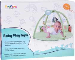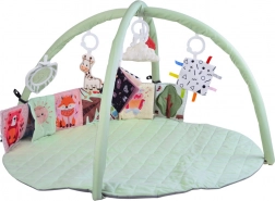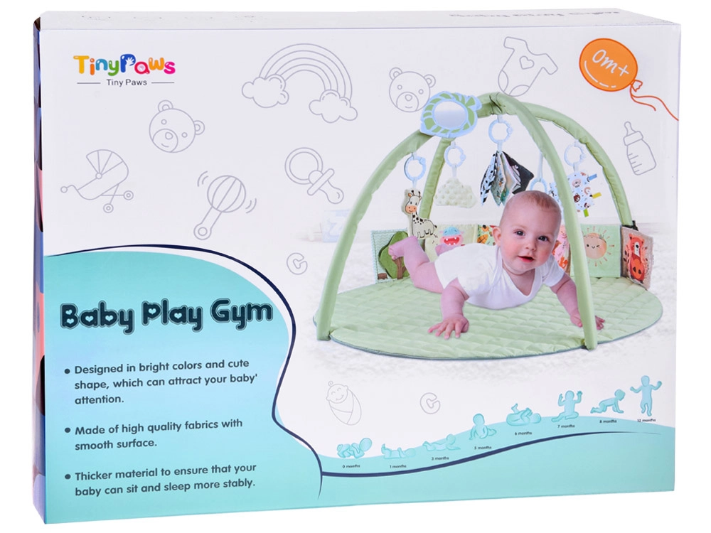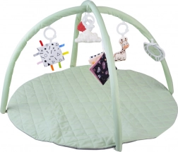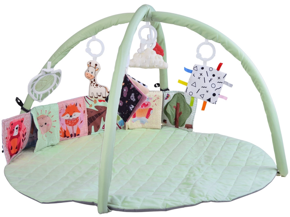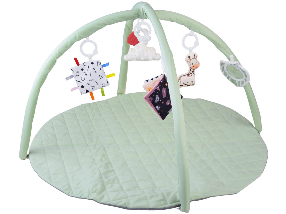 Diese runde, sanft gepolsterte Spieldecke in Pastell-Mint schafft einen sicheren und bequemen Ort für tägliche Entdeckungen. Zwei flexible Bögen mit einfacher Abnahme ermöglichen eine schnelle Pflege und ein kompaktes Verstauen für Reisen. Unterschiedliche Texturen, knisternde Elemente und kontrastreiche Muster fördern auf natürliche Weise Sehen, Hören und Fühlen, während hängende Spielzeuge zum Greifen, Strampeln und Drehen animieren.