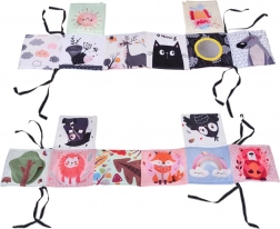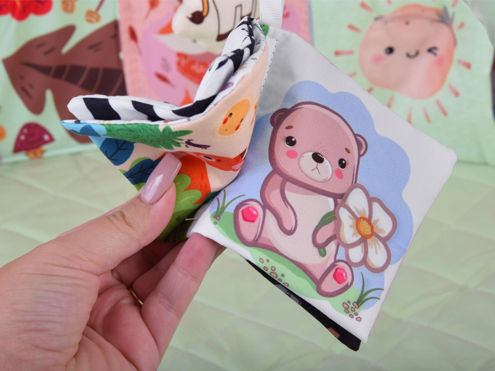 Leichte Stoffbüchlein mit bunten und kontrastreichen Motiven sowie integriertem Spiegel fördern die visuelle Aufmerksamkeit, Neugier und die ersten Interaktionen des Babys.