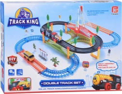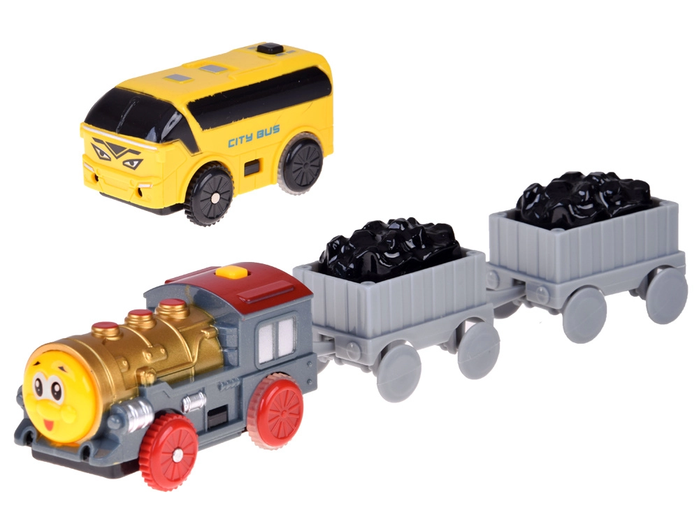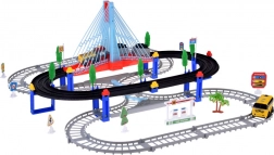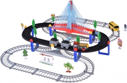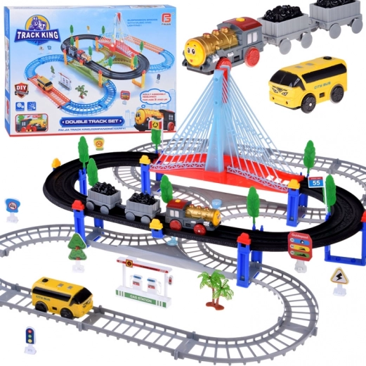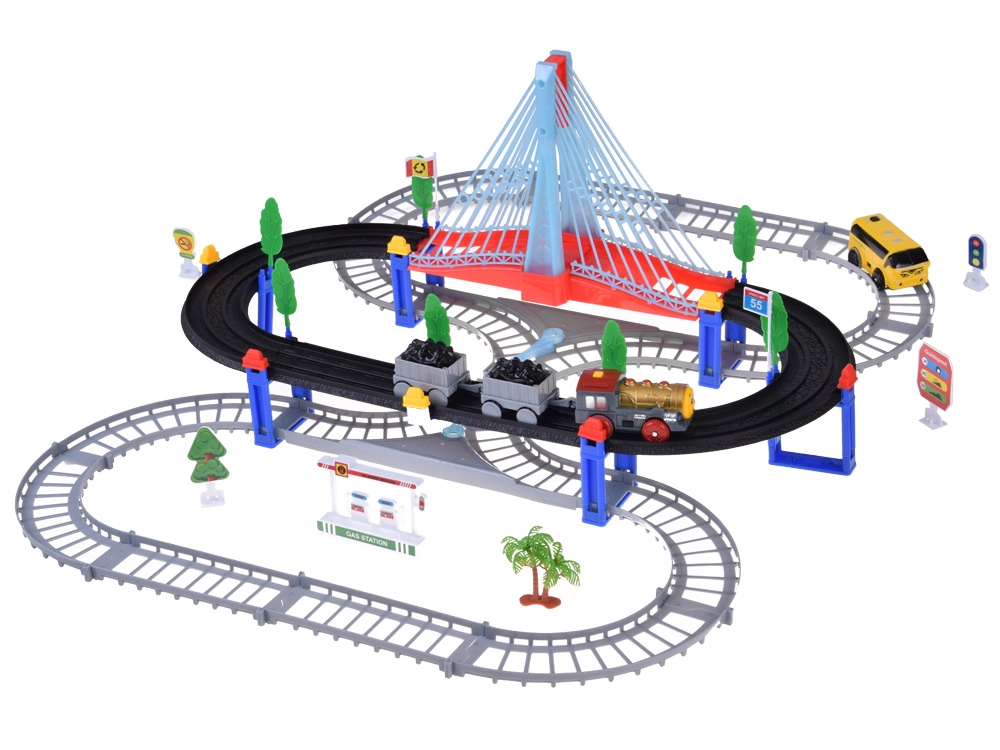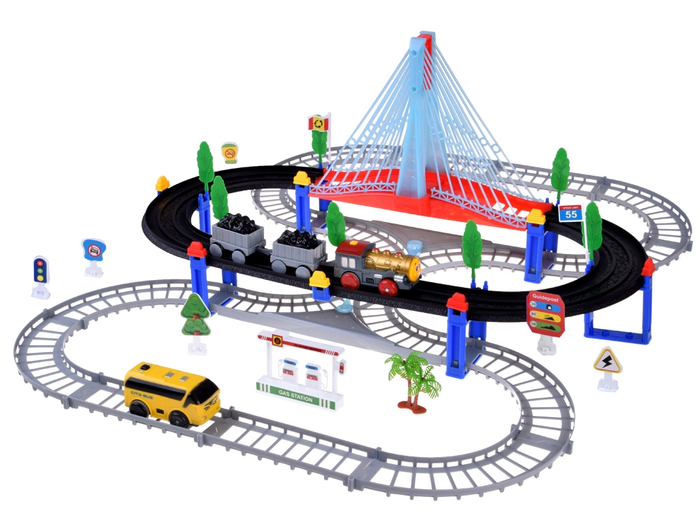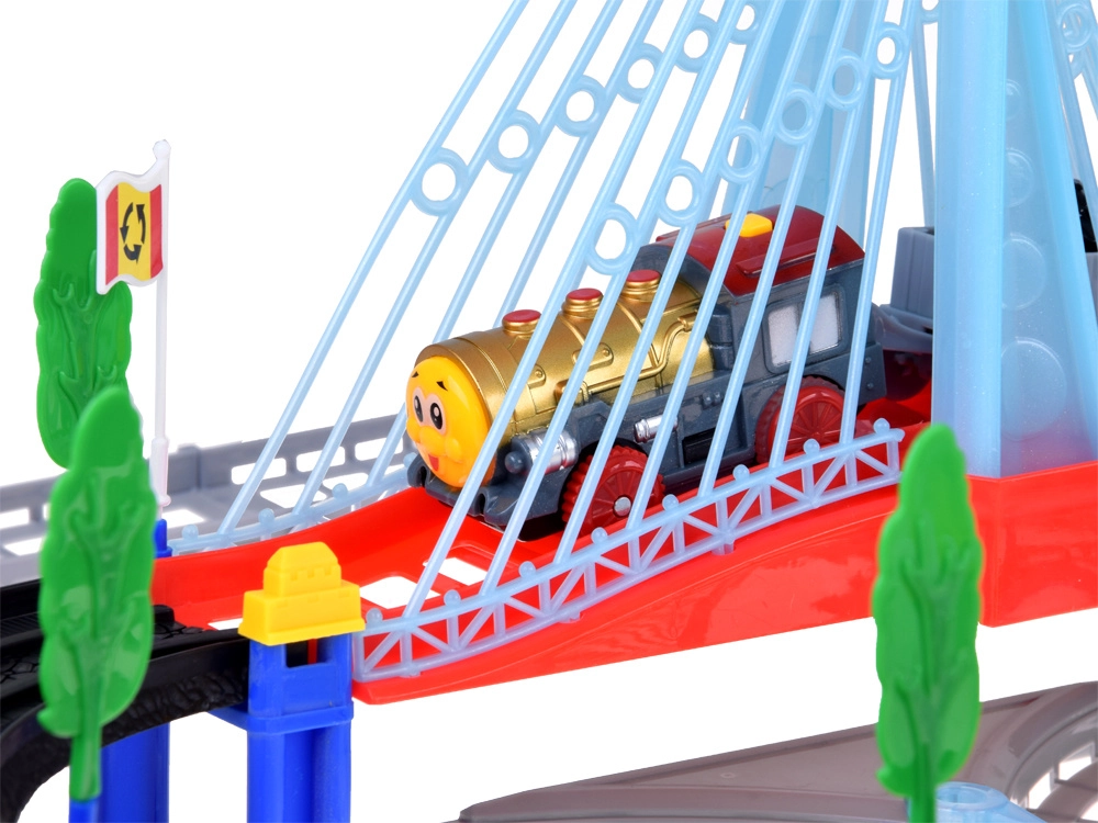Diese elektrische Eisenbahn mit mehrstöckigen Gleisen und Hängebrücke bietet Kindern stundenlangen kreativen Spielspaß. Die Lokomotive mit Waggons und der gelbe Stadtbus bewegen sich auf verbundenen Strecken, überqueren die Brücke und passieren Verkehrsschilder, Bäumchen und eine kleine Tankstelle. LED-Beleuchtung sowie Lokomotivgeräusche und Melodien verleihen dem Spiel besondere Authentizität.