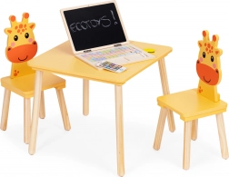 Schaffen Sie für Ihre Kinder eine zauberhafte Ecke für kreative Aktivitäten. Der Kindertisch mit breiter, leicht zu reinigender Platte und zwei Stühlchen mit Rückenlehnen in Giraffenform macht den Raum gemütlich und unterstützt Selbstständigkeit sowie korrektes Sitzen. Massive Holzbeine und eine solide Verarbeitung gewährleisten Langlebigkeit und Sicherheit im täglichen Gebrauch.